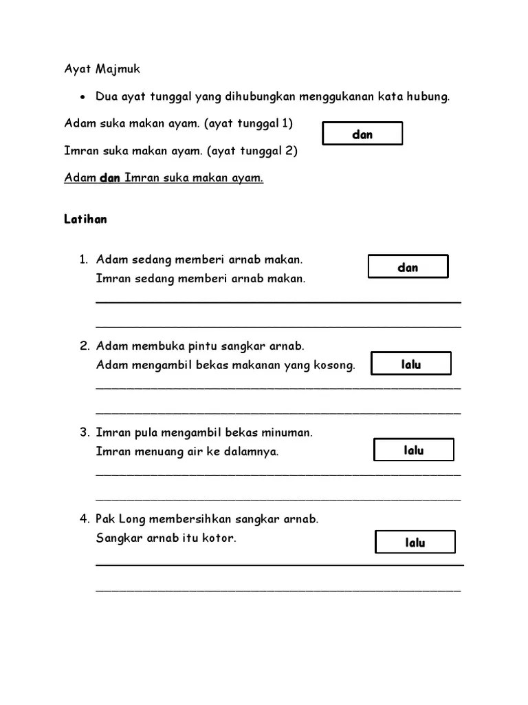 Lengkapkan ayat majmuk menggunakan kata hubung yang sesuai. Latih tubi latihan bahasa melayu tahun 3 2020 from joyfunlearn membina ayat . Bahasa melayu kata majmuk worksheet. Latihan bahasa melayu bagi pelajar spm. Latihan bina ayat majmuk thn 2. Latihan ayat tunggal dan ayat majmuk by zaira_ara. Ayat tunggal latihan tahun 3. Latihan membina ayat majmuk flip ebook . Contoh soalan ayat majmuk pt3 kuora x. 60 soalan latih tubi tatabahasa kata hubung malay language grammar and vocabulary . Sila tonton video ini sebagai rujukan bagi latihan bm m.s 15 jilid 1. Latihan industri contoh resume untuk praktikal. Play this game to review other. Saya ______ munif memancing ikan.